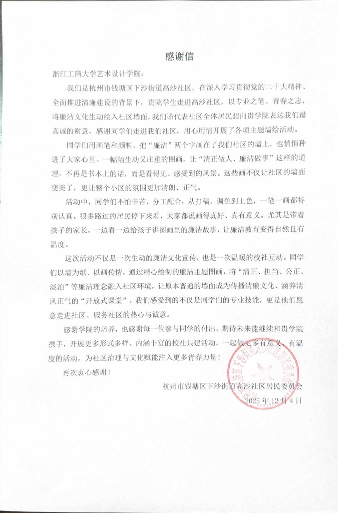 近日,艺术设计学院收到高沙社区居民委员会的感谢信,信中对同学们用画笔传递清廉理念、用艺术服务社区表达了诚挚谢意。信中提到,同学们绘制的廉洁主题墙画不仅美化了环境,更在潜移默化中影响着不同年龄段的居民。“一幅幅生动又庄重的图画,让‘清正做人、廉洁做事’的道理,从书本走进生活,也悄悄种进了大家心里。”